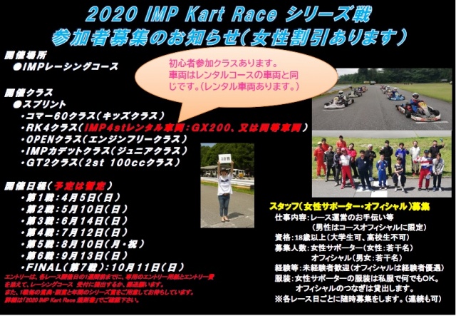 4月からレーシングコースでカートレースシリーズ戦が開催されます。そこで、運営のお手伝いをしていただける女性サポーター・コースオフィシャルを募集します。勿論レースに参加される方も募集します。